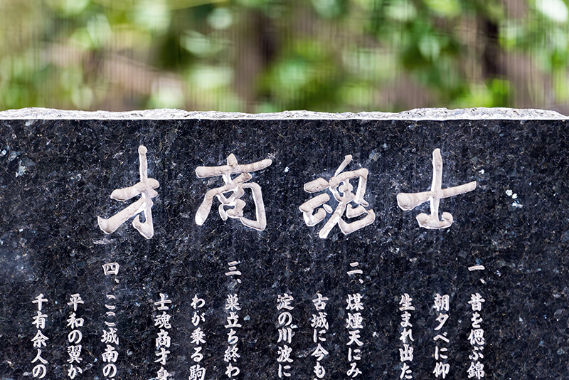 「士魂商才」は商業高校の伝統訓でもあり、「利益をあげるお金を稼ぐだけの才能ではなく、知性に裏付けられた商才をもつこと」を意味する。また石碑裏面には、校歌を書き忘れられることのない母校の歌を記した。