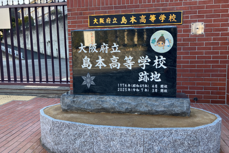 大阪府立島本高校は、令和7年3月31日をもって閉校となりました。島本高校の思い出や歴史を後世に残すために、閉校モニュメントの建立するお手伝いをさせて頂きました。正面右側には、島本高校の生徒の方がデザインしたマスコットキャラクター「のこ」と「たけたけ」が施され、裏面には、校歌と、昭和47年から始まる学校の沿革が印されています。